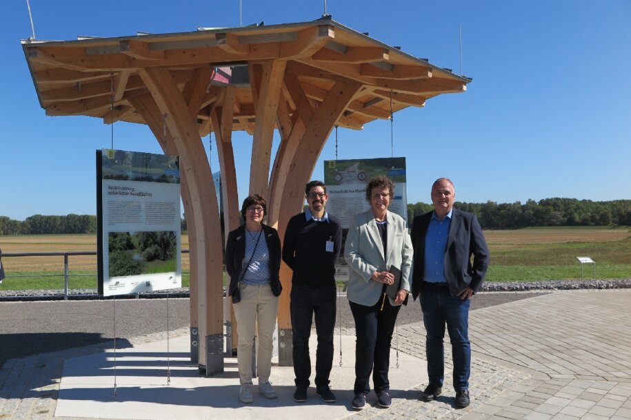 Polders machen können, wurde durch den Landesbetrieb Gewässer im Regierungspräsidium Karlsruhe ein Info-Pfad mit zwölf Infotafeln eingerichtet: Sechs Tafeln sind entlang des Dammes angeordnet, sechs weitere in einem Pavillon, dem Herzstück des Pfades. Die Infotafeln und der Pavillon wurden heute, 18. September 2025, von Regierungspräsidentin Sylvia M. Felder und Bürgermeister Stefan Martus in Anwesenheit weiterer politischer Vertreterinnen und Vertreter sowie den Projektbeteiligten feierlich eingeweiht.