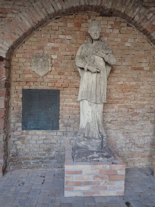 Die alte Nepomukstatue aus der „Burda-Anlage“ steht nun witterungsgeschützt im offenen Bereich des Museumsanbaus.