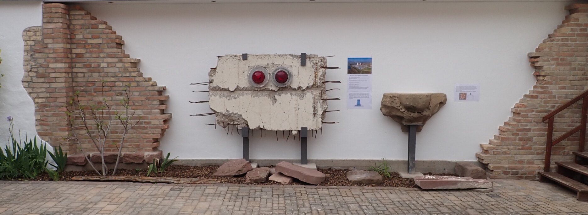 Vor der Ausstellungswand befindet sich ein Randstück des Kühlturms von Block I des Kernkraftwerks Philippsburg (KKP), dessen Beleuchtung noch funktioniert sowie der Schlußstein des ehemaligen "Weißen Tor", welches sich direkt neben dem heutigen Museum befand.
