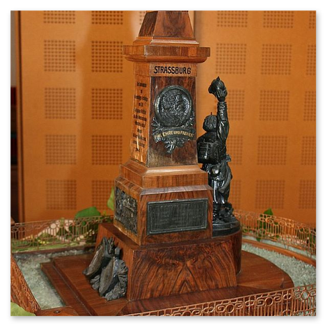 Weil es zu einem der bedeutendsten Denkmäler im badischen Raum zählte, soll es mit den Worten der Festschrift von 1899 beschrieben werden: „Das Kriegerdenkmal bildet in der Hauptsache einen quadratischen Aufbau, auf dessen halbkreisförmig nach vorne abschließendem Unterbau sich der Hauptschmuck des Denkmals befindet... Ein im Sturm vorangegangener Krieger hat ein feindliches Geschütz erobert und ergreift von demselben Besitz, das Gewehr auf das Geschütz stützend; die Rechte schwenkt den Helm. Alles am Krieger atmet Temperament und Begeisterung. Das Geschütz ist ziemlich zerschossen; das eine Rad fehlt ganz. Den Abschluß des Ganzen bildet die deutsche Kaiserkrone, das Symbol der auf den Schlachtfeldern heiß erkämpften deutschen Einheit" Die Widmungen auf der Vorder- und den beiden Längsseiten ist den Kriegern von 1870/71 gewidmet, während die Rückseite an den Festungskommandanten Rheingraf Karl August erinnert. Die Widmungsinschrift über einem Festungsrelief lautet: „Dem Kommandanten und heldenmütigen Verteidiger von 1799, dem großen Wohltäter und edlen Menschenfreunde, Feldmarschall-Leutnant Rheingraf Karl August von Salm- Grumbach, in dankbarer Erinnerung gewidmet.