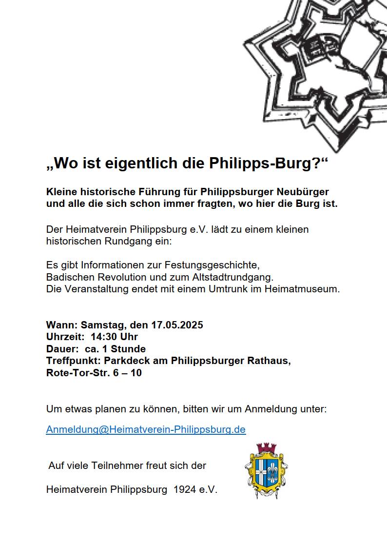 Erfreuliche 30 Teilnehmer nahmen an der Führung des Heimatvereins Philippsburg für Neubürger und geschichtlich Interessierte am vergangenen Samstag teil. Für den Einstieg in die Historie Philippsburgs ist eine Erläuterung am Festungsmodell im Rathaus unerlässlich. Hier begann Vorstandschaftsmitglied Lino Geißler in gewohnt eloquenter Weise den Abriss durch die Geschichte. Nach dem Festungsmodell ging der Spaziergang zum katholischen Pfarrzentrum, auf dessen Gartengelände man noch das Geländeniveau der Vor-Festungszeit sehen kann. In der Schlossstraße wurde der Standort der Burg, aus der später das Schloss wurde, gezeigt. Auf dem Ile-de-Re-Platz vor der Kirche gab es Informationen zu Ereignissen in Philippsburg während der badischen Revolution, zum Altstadtrundgang und zum Festungs-und waffengeschichtlichen Museum im Senator Dr. Burda-Haus. In der Weißen-Tor-Straße wurde mit dem Bürgerhaus Philippsburgs ältestes Haus gezeigt, an dessen Giebel sich auch eines der Wandbilder, die Szenen aus der Festungsgeschichte darstellen, befindet. In der Zeughausstraße wurde auf das Mahnmal für die deportierten jüdischen Mitbürger und auf die einzigartige Jugendstilfesthalle hingewiesen. Vorbei am Eingang zu den Festungskasematten auf dem „Schnogebuckl“ wanderte die Gruppe dann zum Heimatmuseum, wo die Führung mit einem Umtrunk und netten Gesprächen endete.