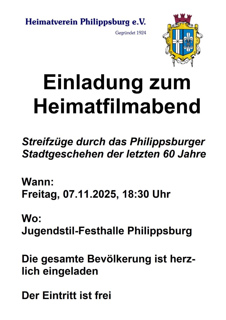 Über eine überwältigend voll besetzte Festhalle konnte sich der Heimatverein Philippsburg am vergangenen Freitag, den 07.11.2025 freuen. Auf dem Programm stand der Film mit dem Titel: „Streifzüge durch das Philippsburger Stadtgeschehen der letzten 60 Jahre“. Der Film, z.T. zusammengesetzt aus Filmteilen des Heimatfilms 2024 beleuchtet die gesamte Breite des Stadtgeschehens, von Schnakenbekämpfung, runden Geburtstagen, Kindergartengeschehen, Eishockey auf dem Freyer, Seefesten, KKP, Goodyear, Salmkaserne und noch einiges mehr.