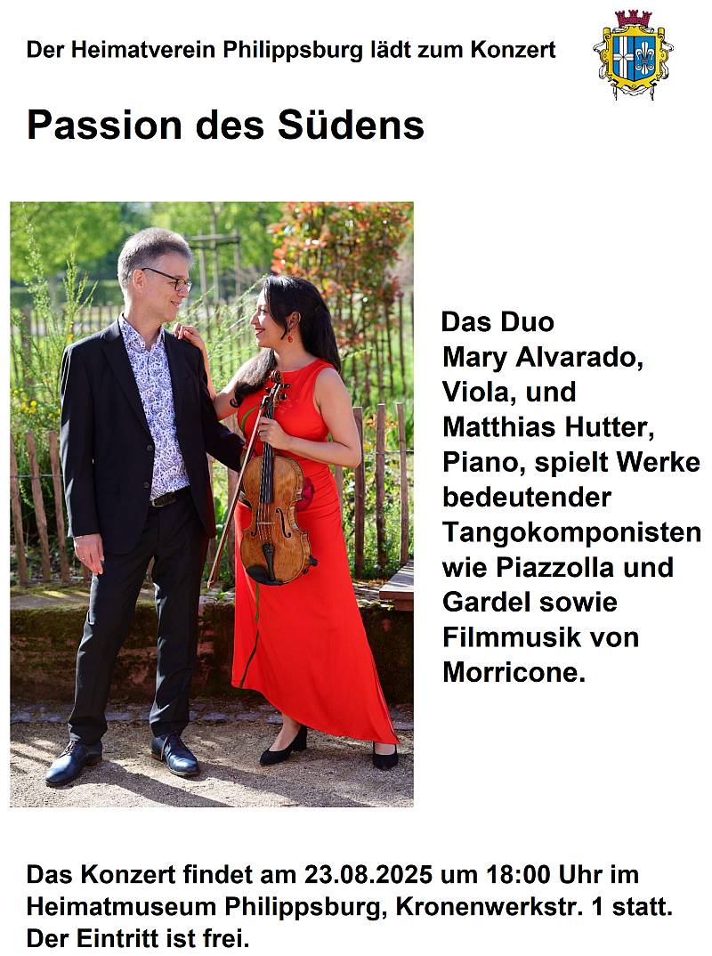 Auch das zweite Konzert unter freiem Himmel am Samstag, den 23.08.25 erwies sich als Publikumsmagnet. Das Programm begann mit „Oblivion“, einem Werk des argentinischen Komponisten Astor Piazzolla. Dann führte die geografische Musikreise mit „Salut d’amour“ von Edward Elgar kurz auf die britische Insel um sich sofort wieder südlicheren Gefilden zuzuwenden. Mit Manuel de Fallas Werk „Nana“ streiften wir kurz die iberische Halbinsel Richtung Südamerika. Mit „Noche de Luna entre Ruinas“ von Mariano Valverde und „Viajerja del Rio“ von Manuel Yanez folgten Stücke guatemaltekischer und venezuelanischer Komponisten. Mit einem letzten Abstecher nach Italien mit Ennio Morricones „Love Theme“ aus dem 1988 gedrehten Film „Cinema Paradiso“ ging es zurück zum Ausgangspunkt der Reise. Nach Carlos Gardels „El dia que me quieras“ endete das Konzert mit „Le grand Tango“ von Astor Piazzolla, dem „König des Tango“. Mit der „Passion des Südens“ trafen Mary Alvarado (Viola) und Matthias Hutter (Piano) den Geschmack des Publikums. Die Künstler verstanden es, die Romantik, die Sehnsucht, Leidenschaft und Melancholie der Stücke der begeisterten Zuhörerschaft aufs Eindrucksvollste zu vermitteln. Zusätzlich führte Matthias Hutter mit wissenswerten Informationen zu Komponist und Werk anregend durchs Konzert. Die rund 100 Zuhörer quittierten die Darbietungen des Duos mit anhaltendem Applaus und dem Wunsch ein solches Konzert im nächsten Jahr zu wiederholen.