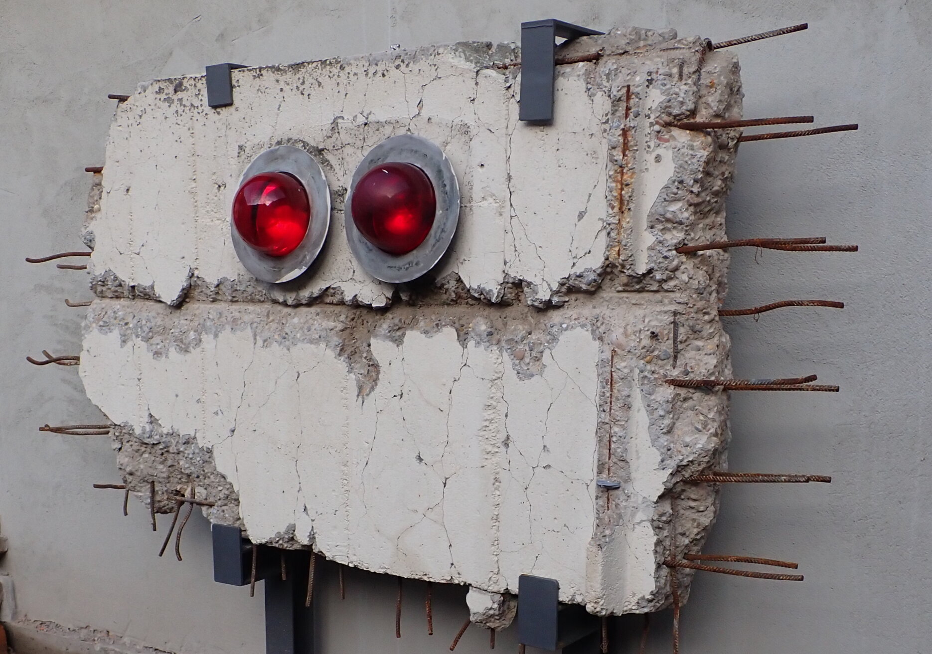 Vor der Ausstellungswand befindet sich ein Randstück des Kühlturms von Block I des Kernkraftwerks Philippsburg (KKP), dessen Beleuchtung noch funktioniert sowie der Schlußstein des ehemaligen "Weißen Tor", welches sich direkt neben dem heutigen Museum befand.