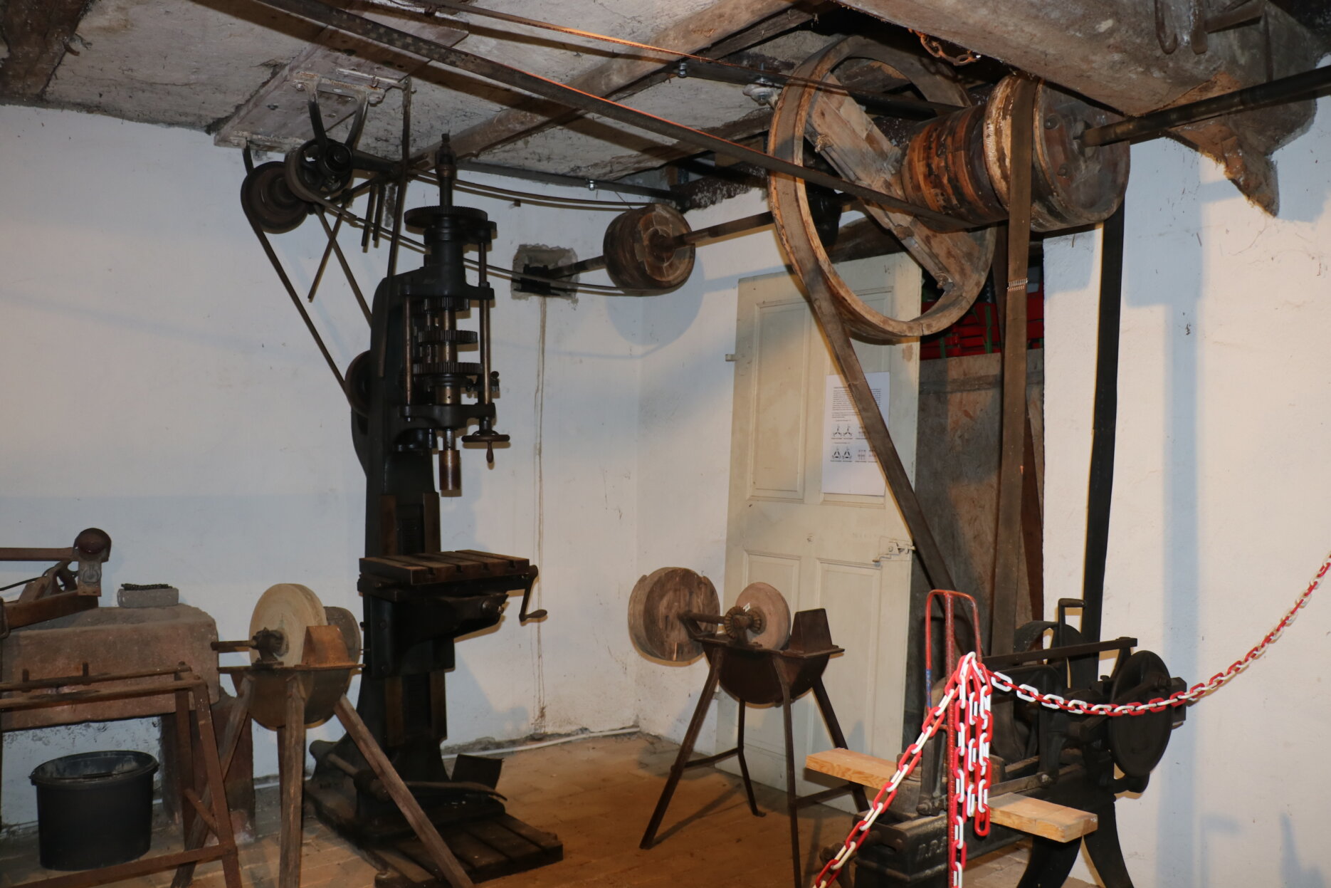 In der Werkstatt sind mit Riemen angetriebene Maschinen zu sehen und z. T. auch funktionsfähig. Ein Teil der Maschinen war früher in der Werkstatt vom „Fahrrad Steidinger“ in Philippsburg in Betrieb.