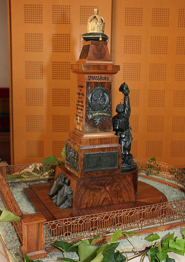 Weil es zu einem der bedeutendsten Denkmäler im badischen Raum zählte, soll es mit den Worten der Festschrift von 1899 beschrieben werden: „Das Kriegerdenkmal bildet in der Hauptsache einen quadratischen Aufbau, auf dessen halbkreisförmig nach vorne abschließendem Unterbau sich der Hauptschmuck des Denkmals befindet... Ein im Sturm vorangegangener Krieger hat ein feindliches Geschütz erobert und ergreift von demselben Besitz, das Gewehr auf das Geschütz stützend; die Rechte schwenkt den Helm. Alles am Krieger atmet Temperament und Begeisterung. Das Geschütz ist ziemlich zerschossen; das eine Rad fehlt ganz. Den Abschluß des Ganzen bildet die deutsche Kaiserkrone, das Symbol der auf den Schlachtfeldern heiß erkämpften deutschen Einheit" Die Widmungen auf der Vorder- und den beiden Längsseiten ist den Kriegern von 1870/71 gewidmet, während die Rückseite an den Festungskommandanten Rheingraf Karl August erinnert. Die Widmungsinschrift über einem Festungsrelief lautet: „Dem Kommandanten und heldenmütigen Verteidiger von 1799, dem großen Wohltäter und edlen Menschenfreunde, Feldmarschall-Leutnant Rheingraf Karl August von Salm- Grumbach, in dankbarer Erinnerung gewidmet.